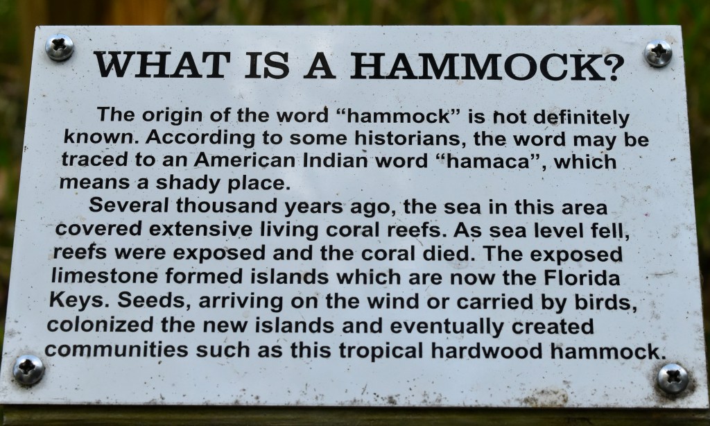 The Park also has good walking trails. We walked the Nature Trail through the Royal Palm Hammock, which is a salt marsh and mango habitat. We had seen the term “hammock” on street names and place names, but did not understand where it came from; we could not find a satisfactory explanation, even on-line. The Florida State Parks are trying to help!