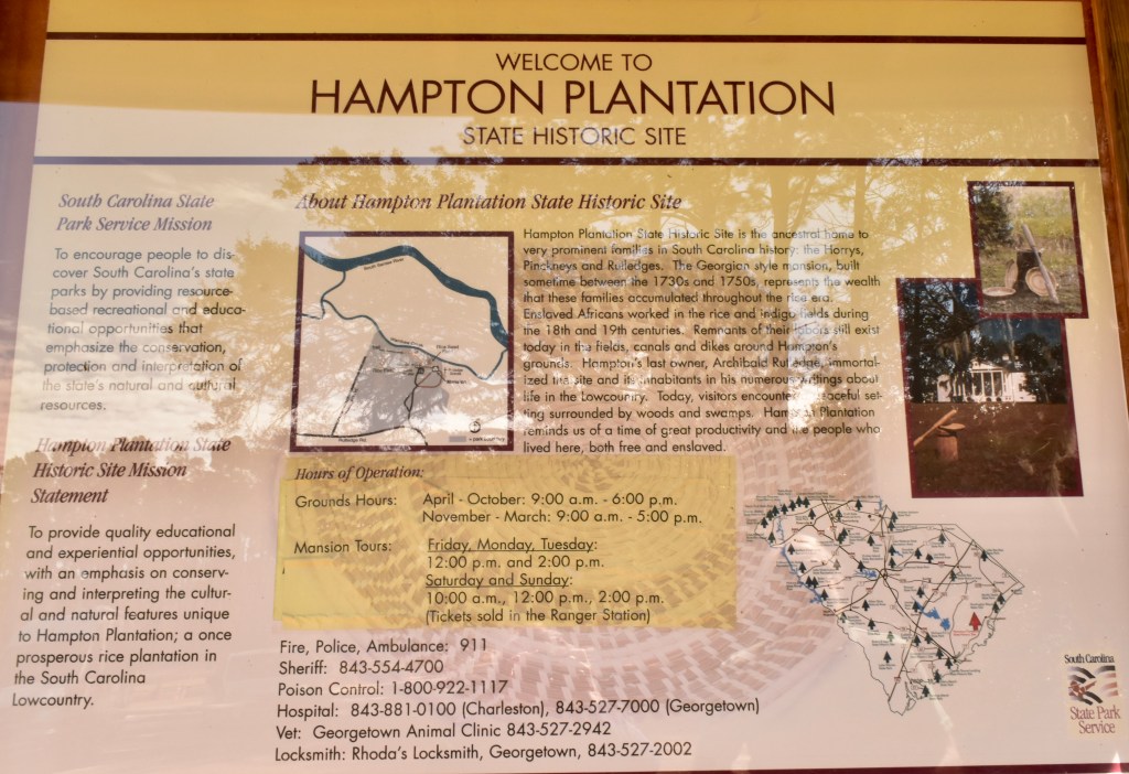 On March 2, 2020 we left James Island in Charleston, South Carolina. On our way out of the county park we stopped to watch some pond yachts racing. We headed north on Route 17 through Charleston and the Francis Marion National Forest. We stopped at the Hampton Plantation State Historic Site, the location of one of the largest rice and indigo plantations in that part of South Carolina. The swamp land was cleared and cultivated by enslaved people who actually taught their owners how to grow rice and made South Carolina one of the richest states in the 19th Century. After the Civil War many of the people freed stayed on to work the plantation.