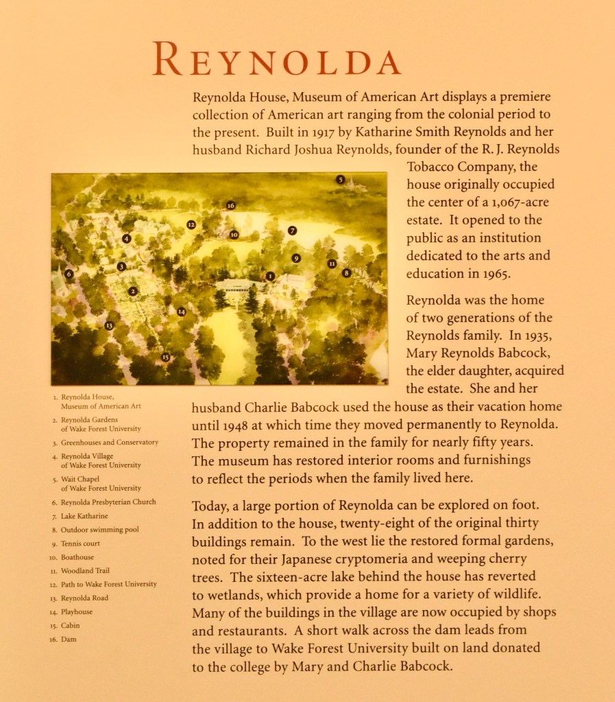 Reynolda is the home of R.J. Reynolds’ and his wife Katharine’s home built in 1917. It is adjacent to Wake Forest University, the land for which R.J. Reynolds donated. A place we never knew about previously, it houses a wonderful collection of American Art. It was fascinating; a very comfortable home, suitable for entertaining, but not at all pretentious.