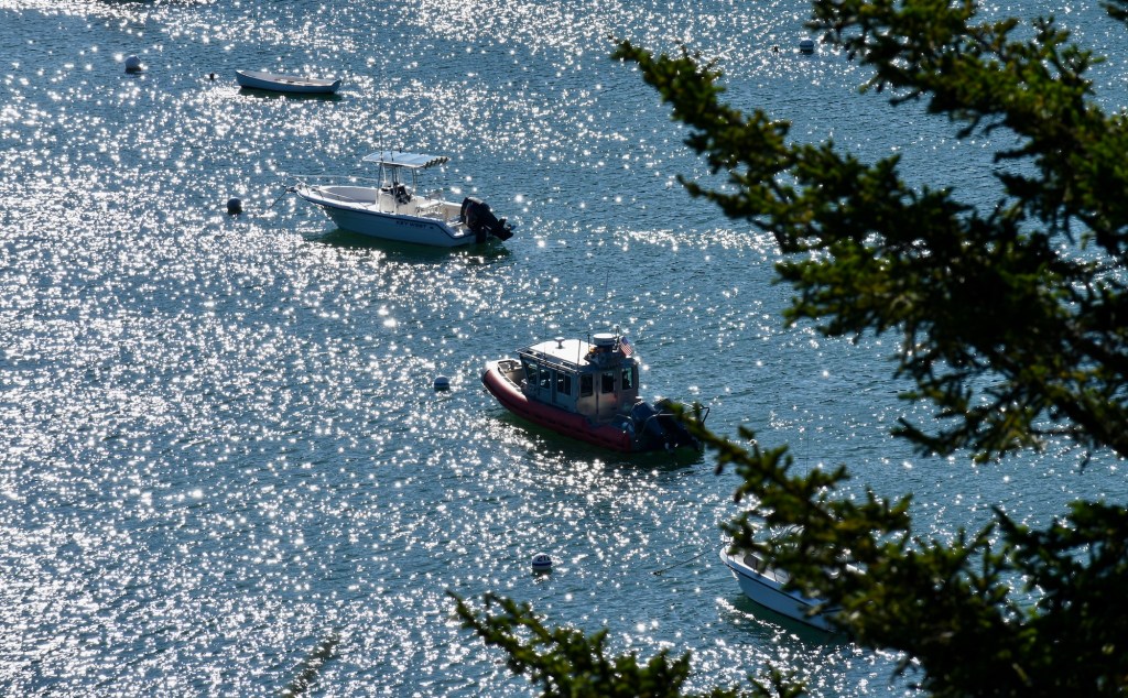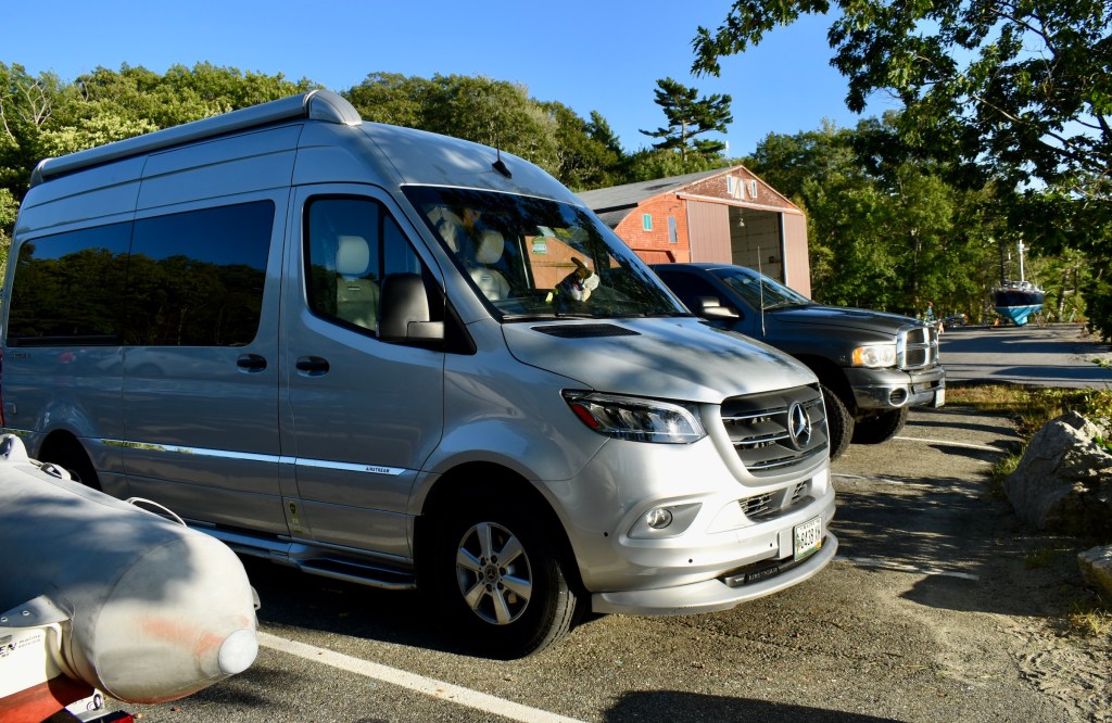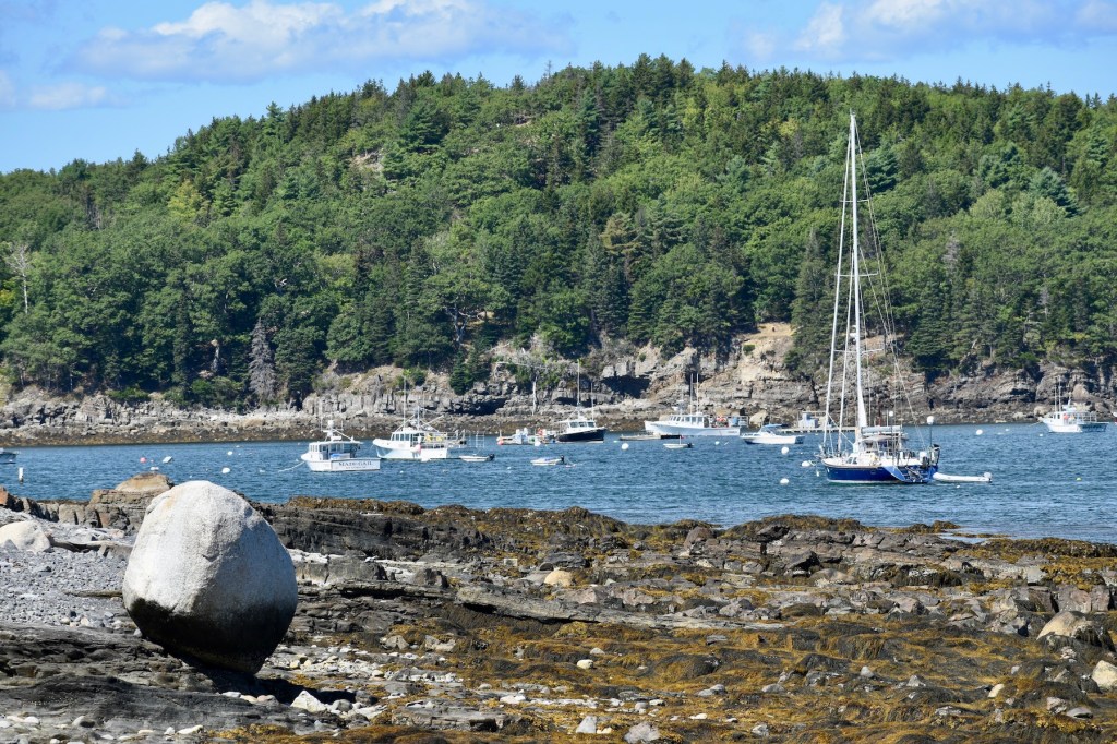 Sylvie is quite comfortable parked alongside an inflatable. The last picture is looking back across Somes Sound to our campground.