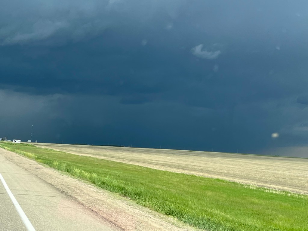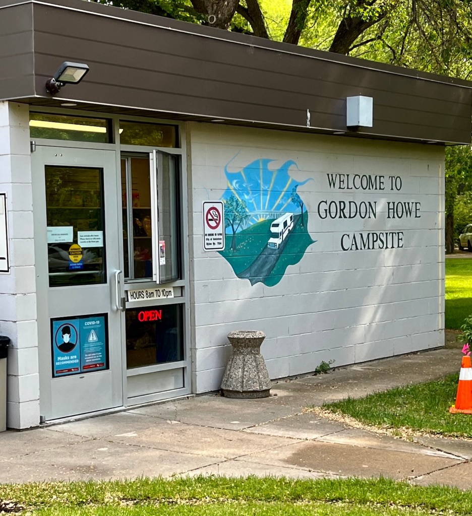 We drove north on Route 2 between 3 cells of thunderstorms, then west to Saskatoon, passing 2500 miles on our trip meter. We stayed at the Gordon (Gordy) Howe campground right in Saskatoon where Doug watched some local sports teams play on the Gordon Howe fields.