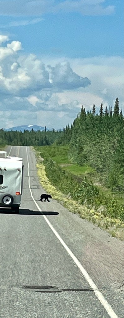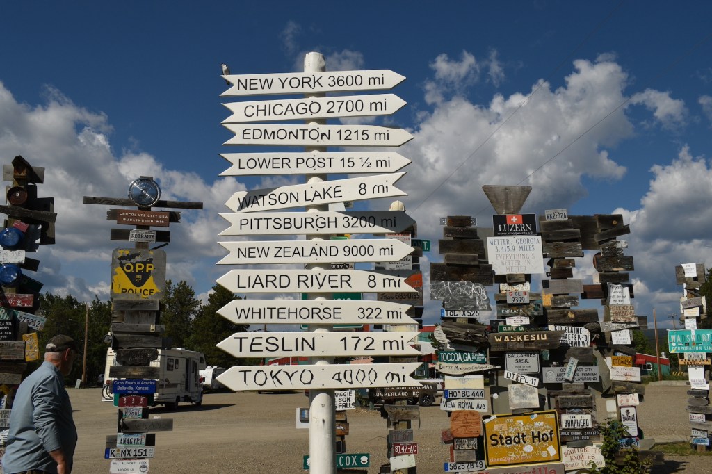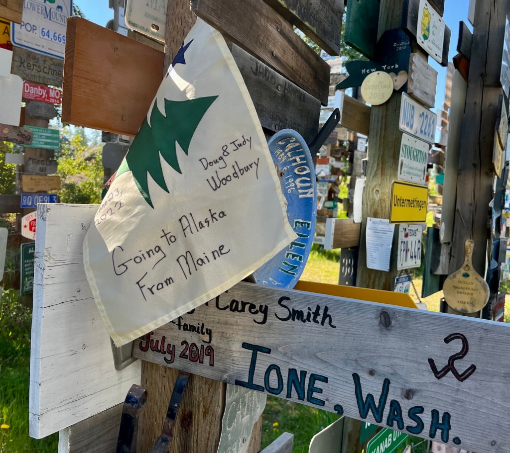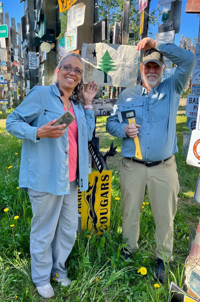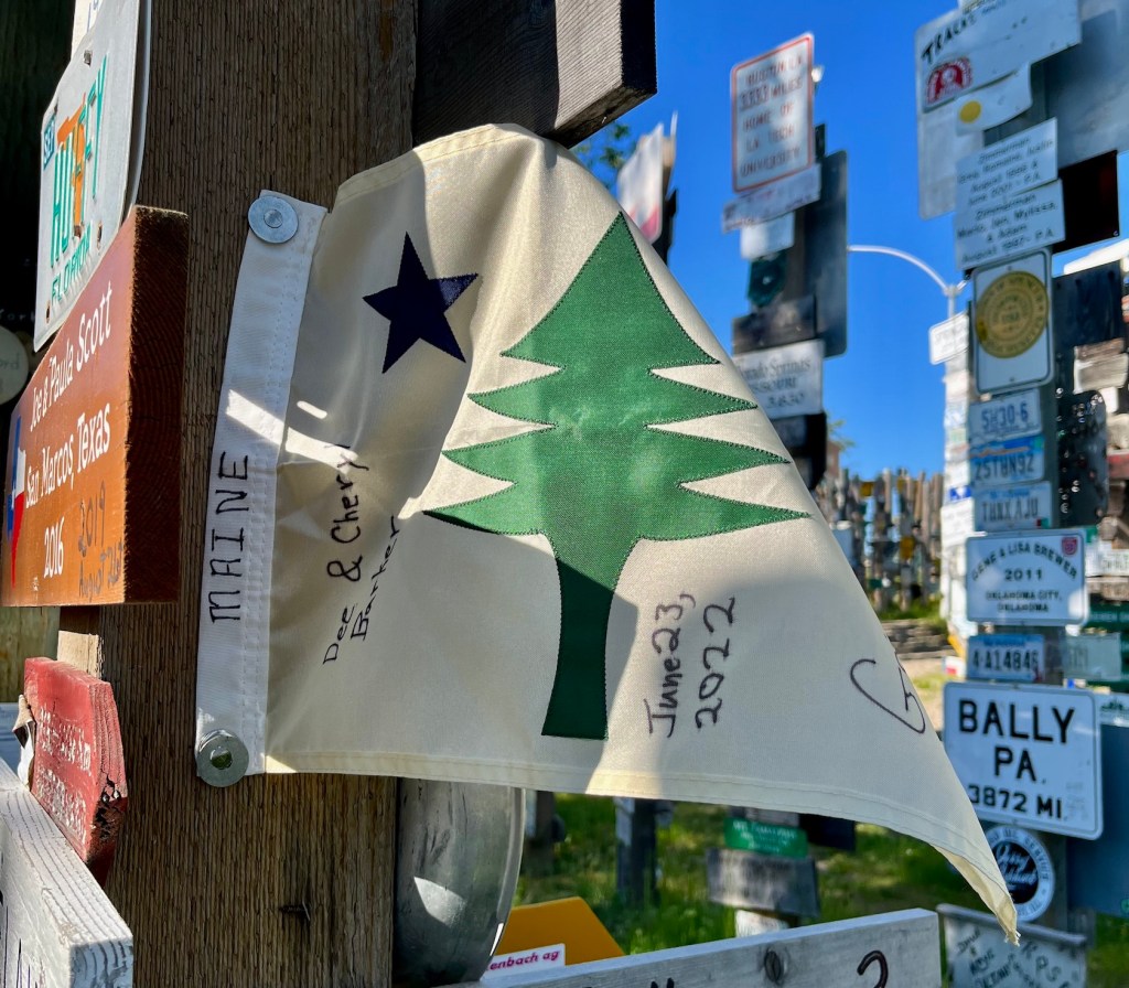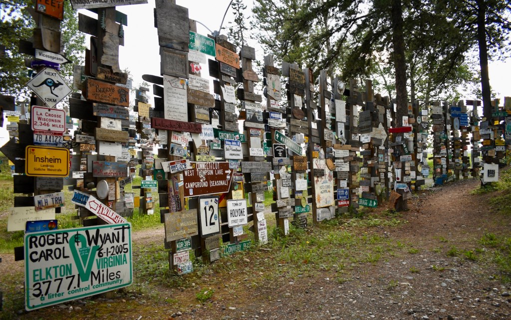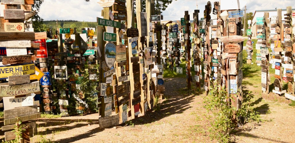 Watson Lake is famous for its Sign Post Forest. We participated with an Old Maine Flag. If you are overwhelmed by the photos, it’s nothing like standing in the middle of it all. Dee and Cheryl have participated on past trips, but were not able to locate any of their prior contributions.