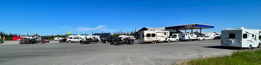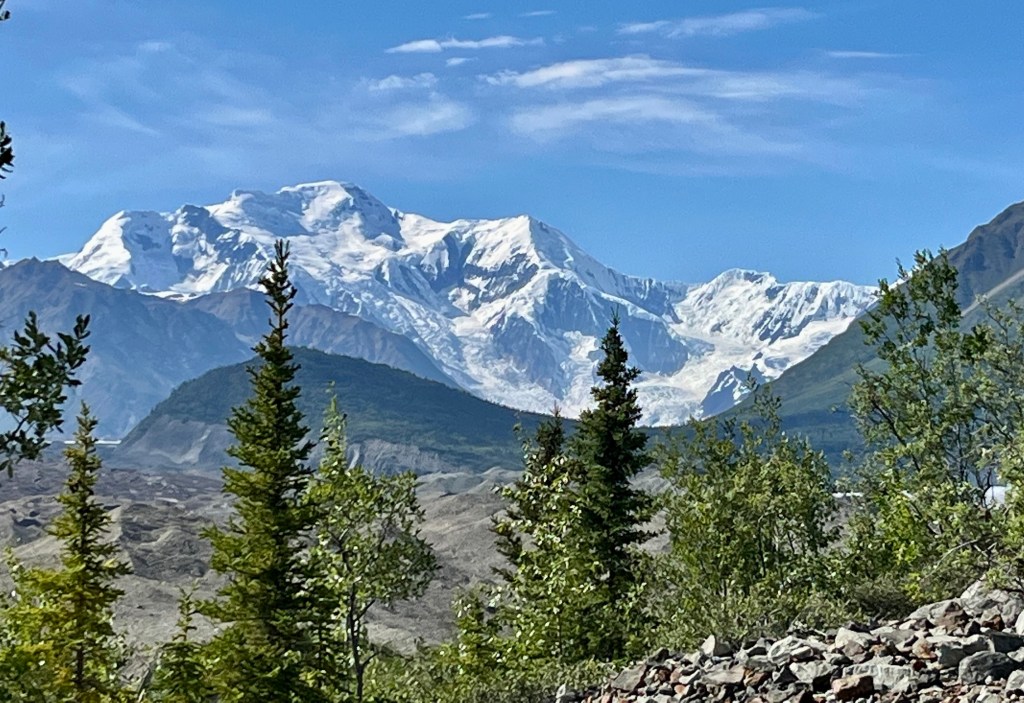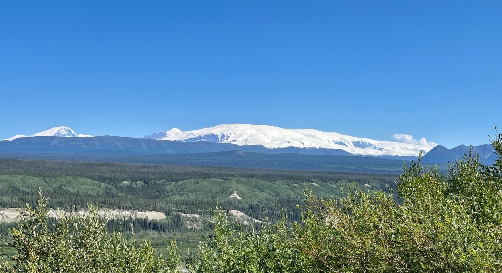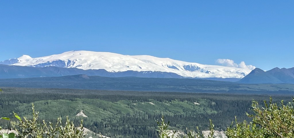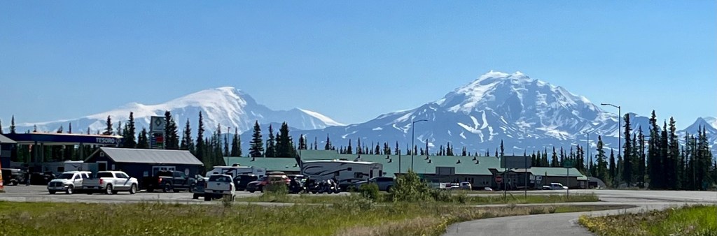 Mount Sanford (elevation 16,237 feet) and Mount Drum (elevation 12,010 feet) were visible from Glennallen, with the lines of RV’s waiting for fuel in the foreground. The Wrangell-St. Elias National Park and Preserve is the largest unit in the US National Park system. It contains 13.2 million acres of wild lands and 9.7 million acres of designated Wilderness. Also it contains the greatest collections of peaks over 16,000 foot on the North American continent, including Mt. St. Elias (elevation 18,029 feet), the second tallest peak in the United States. The park also contains the largest concentration of glaciers, the largest of which, Malaspina Glacier, is larger than the state of Rhode Island.