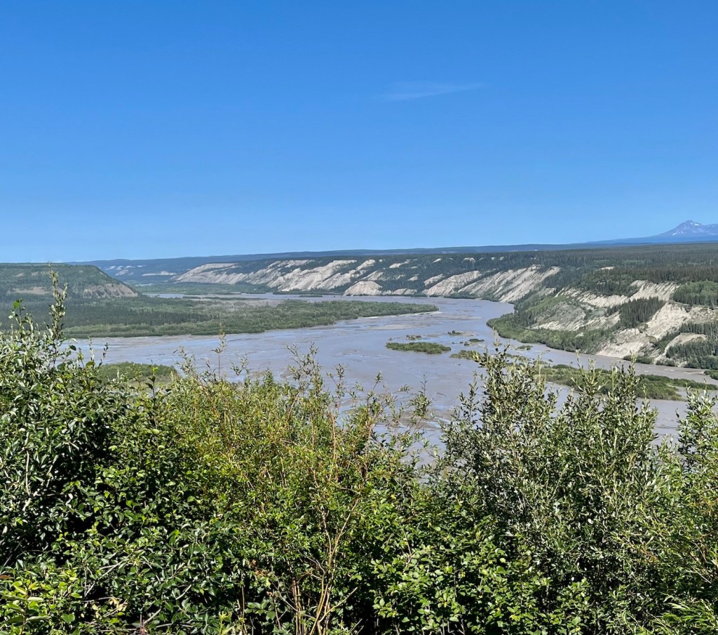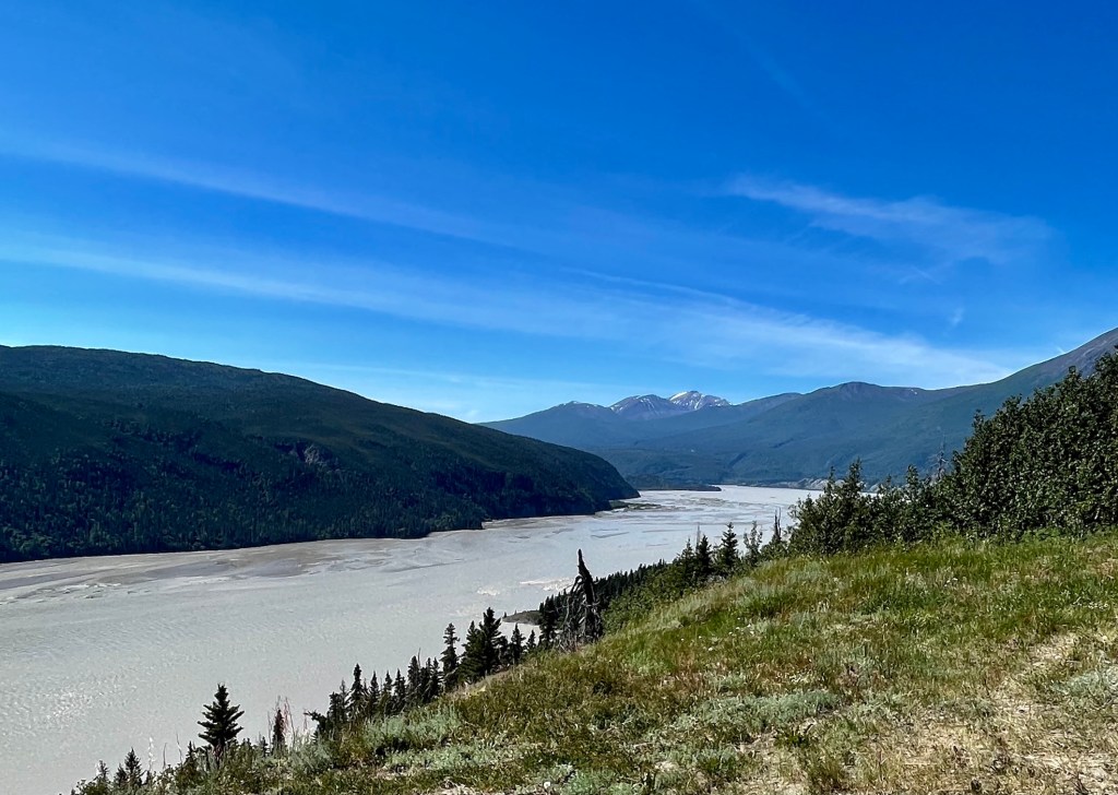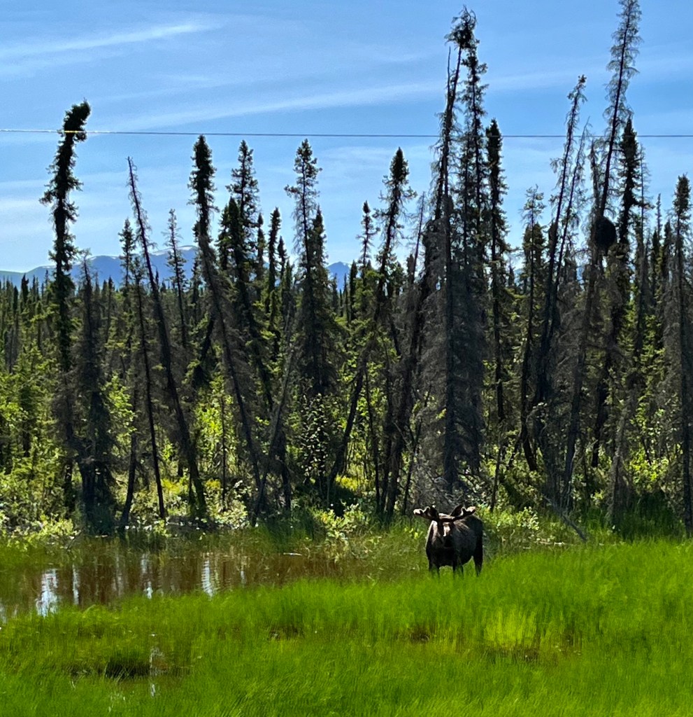 On July 3 we decided to try to drive to Chitina, east of Glennallen and Copper Center. Dee and Cheryl had tried to go there on an earlier trip but the road was too rough and they had turned back. We went east from the Richardson Highway on the Edgerton Highway, also known as the McCarthy Road. Just three miles in Doug, sitting in the shotgun seat said calmly, “oh, a moose”. Everyone said WHAT!!! and we had to find a place to turn around to go see the moose, right next to the highway. Since we always stopped for wildlife, Doug’s calm demeanor became a standing joke.