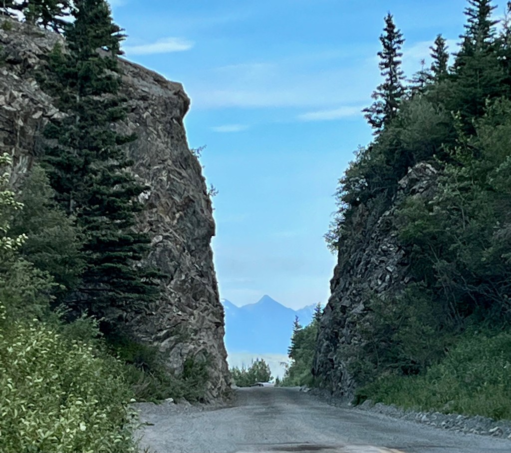 From Chitina east the road is gravel, narrow, and winding for nearly 60 miles. After Chitina there is a bridge over the Copper River and a narrow pass cut into the mountain. The road is located on the right of way of the Copper River & Northwestern Railway. There are narrow cuts through rocks and the bridges are narrow former rail bridges. A stern sign early on “strongly” recommends against travel by RV’s and large vehicles, a sign which obviously is ignored as we found out during the long and bumpy road to McCarthy.