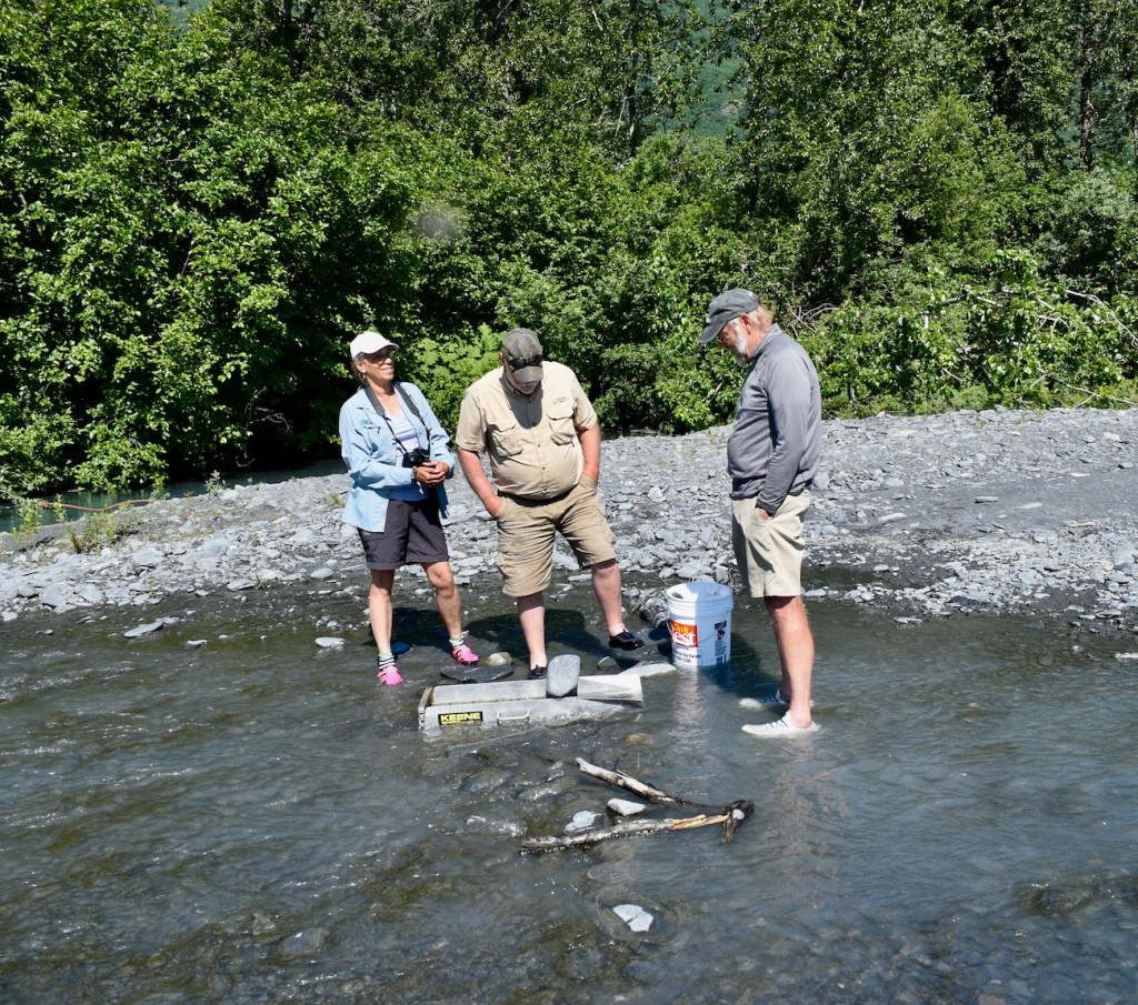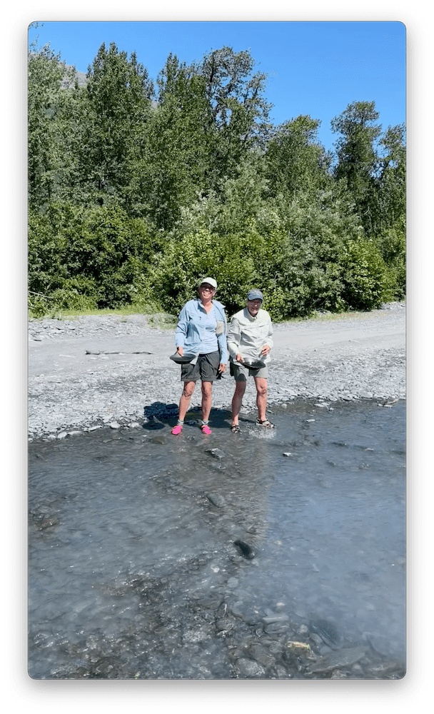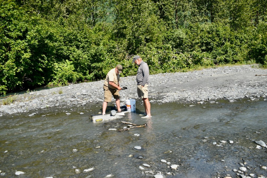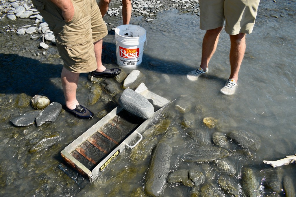 Park on the creek bed – glacier water is very cold.First, fill the 5 gallon bucket with dirt/rocks/debris from the stream – Doug was great.Next, shovel some into the sluice and let the water run through it.Now the real fun begins, panning. The theory is that gold is heavy. All the sand, silt, and whatever else will float away and leave gold in the bottom of your pan. Just keep scooping the icy water and let the sand float away. The nuggets at the jewelry store were a lot larger!
