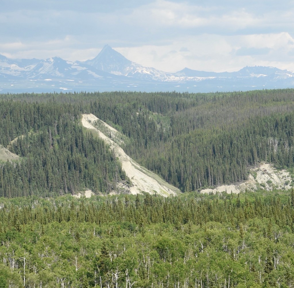 Mount Wrangell in the distance. There is a distinct avalanche field in the foreground.