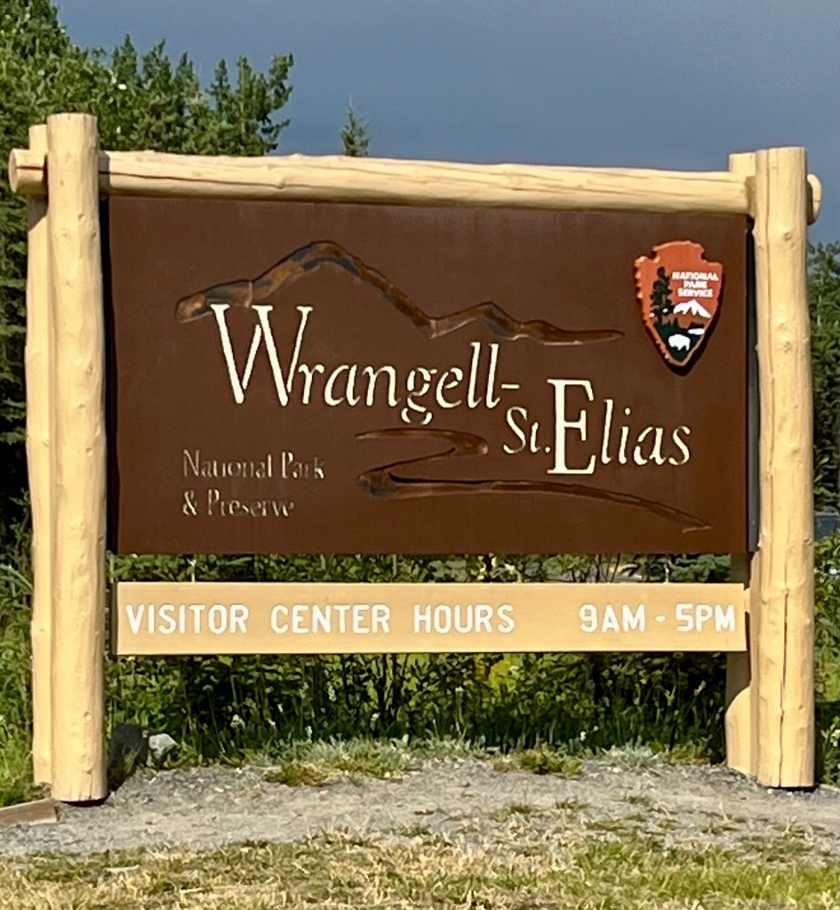 Mount Sanford (elevation 16,237 feet) and Mount Drum (elevation 12,010 feet) were visible from Glennallen, with the lines of RV’s waiting for fuel in the foreground. The Wrangell-St. Elias National Park and Preserve is the largest unit in the US National Park system. It contains 13.2 million acres of wild lands and 9.7 million acres of designated Wilderness. Also it contains the greatest collections of peaks over 16,000 foot on the North American continent, including Mt. St. Elias (elevation 18,029 feet), the second tallest peak in the United States. The park also contains the largest concentration of glaciers, the largest of which, Malaspina Glacier, is larger than the state of Rhode Island.