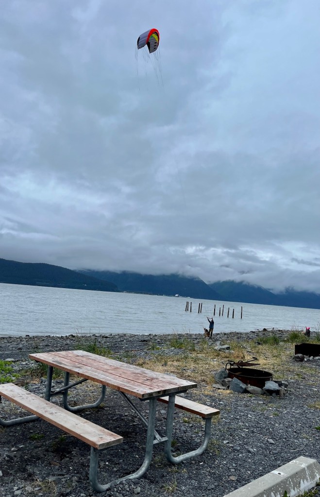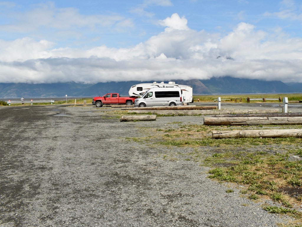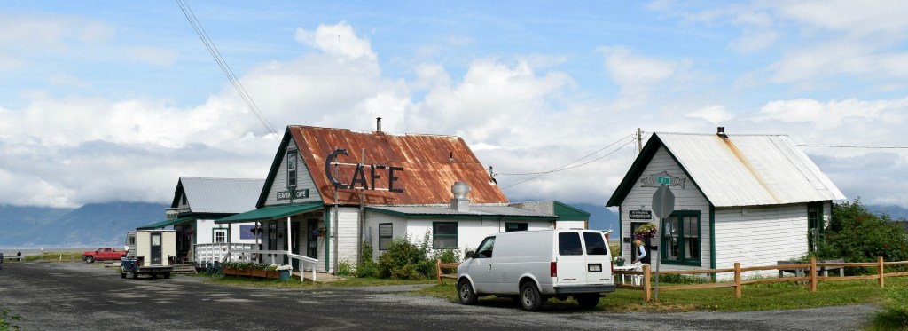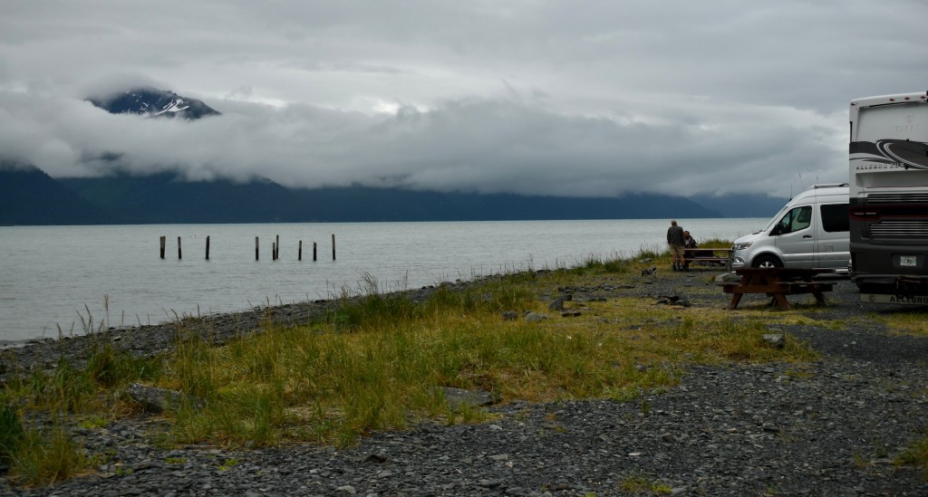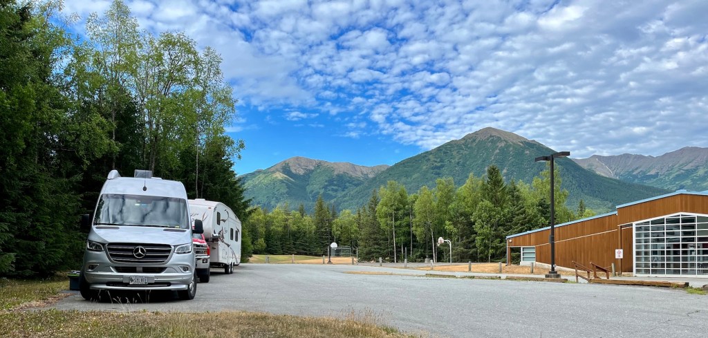 After visiting the critters we drove to Hope, Alaska, on Turnagain Arm. There were no campsites, so we boondocked in the parking lot at Hope School, where Dee cooked a fine steak dinner.